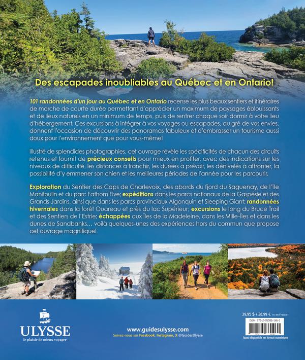 101 randonnées d’un jour au Québec et en Ontario vous invite à vivre des expériences quotidiennes aussi diversifiées que l’exploration du Sentier des Caps de Charlevoix, des abords du fjord du Saguenay, de l’île Manitoulin et du parc Fathom Five; des expéditions dans les parcs nationaux de la Gaspésie, du Mont-Tremblant et des Grands-Jardins, ainsi que dans les parcs provinciaux Killarney, Algonquin et Sleeping Giant; des balades dans les environs de Montréal, Toronto et Ottawa; des randonnées hivernales dans la forêt Ouareau et près du lac Supérieur; des excursions le long du Bruce Trail, des Sentiers de l’Estrie et du Rideau Trail; des échappées aux Îles-de-la-Madeleine et dans les parcs de la Gatineau, des Mille-Îles et Sandbanks, et bien plus encore!