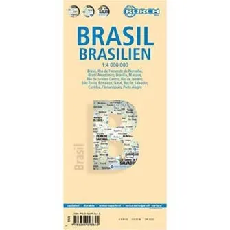 Laminated, waterproof tourist map of Brazil with enlargements for the environs of Rio de Janeiro, plus street plans of Rio, São Paulo, Brasilia, Curitiba, Florianópolis, Fortaleza, Manaus, Natal, Porto Alegre, Recife, and Salvador. The main map at 1:4,000,000 covers most of the country, including the whole of Uruguay and most of Paraguay, extending along the Amazon basin to just before Manaus. The area north of Macapá and the north-west of the country, including the Amazon west of Manaus, is shown as a separate inset at 1;8,000,000. The map highlights national parks and protected areas, as well as places of interest. Road network includes many minor roads and tracks. Local airports and aerodromes are marked in less accessible areas. Topography is shown by relief shading and spot heights, with names of mountain and hill ranges and main peaks. Administrative divisions and names of states are also marked. The maps have no geographical coordinates. Map legend includes English. The index of localities has separate lists of parks and protected areas, beaches and places of interest.