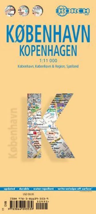 English language laminated road and travel map in color of Copenhagen center and surrounding area. Scale 1:11,000. Indexed in 5 languages with airports, major highways, city streets, one-way roads, pedestrian-only streets, parking, Metro, major hotels, youth hostels, embassies, monuments, churches, castles, police stations, hospitals, post offices, shopping areas, points of interest, vistas, information centers, museums, theaters, libraries, zoo, golf courses, camping sites, lighthouses, windmills and parks. Includes inset maps of Copenhagen Airport (Scale 1:30,000) and Copenhagen region (Scale 1:90,000). Also included is a map of Copenhagen’s public transport system.