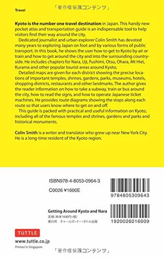 Dedicated journalist and urban explorer Colin Smith has devoted many years to exploring Japan on foot and by various forms of public transportation. Getting Around Kyoto and Nara is conveniently divided into chapters showing the user how to get to Kyoto by air or train, how to get into the city, and how to get around Kyoto and into the surrounding countryside using public transport. It includes chapters for Nara, Uji, Fushimi, Otsu, Ohara, Mt. Hiei, Kurama and other popular tourist areas around Kyoto.
