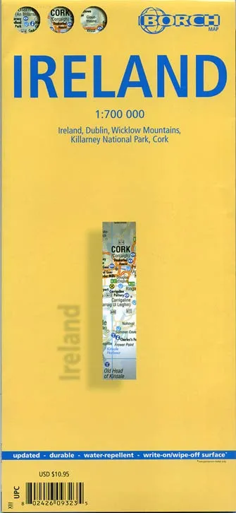 Folded road and travel map in color. Scale 1:700,000. Distinguishes roads ranging from expressways to secondary roads. Legend includes international/regional airports, commutertrain (DART), sights, museums, monuments, churches, monasteries, castles, ruins, Megalithic monuments, , golf courses, bus stations, youth hostels, camping sites, viewpoints, national parks, nature reserves, hotels, markets. Includes inset map of Dublin (1:15,000), Wicklow Mts. (1:350,000), Killarney Nat'l Park (1:100,000), Cork (1:8,000). Climate charts show the average daily temperatures, humidity, hours of sunshine and precipitation for each month.