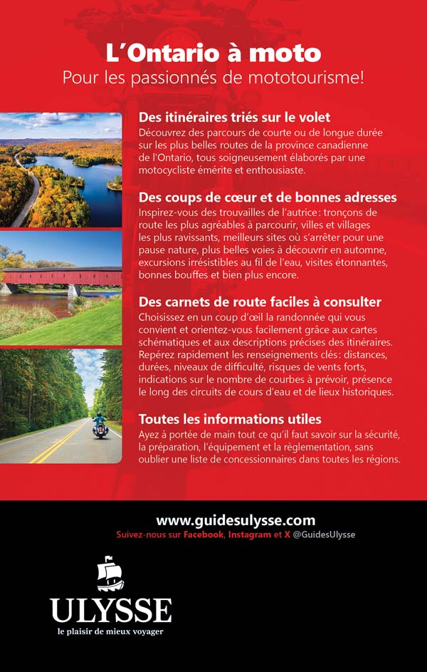Le guide L’Ontario à moto, entièrement en couleurs, vous fait emprunter des routes secondaires sympathiques, des chemins de campagne pittoresques et des routes panoramiques spectaculaires. Il vous conduit ainsi au cœur de la péninsule du Niagara et du Prince Edward County; au fil du canal Rideau et à la découverte des Mille-Îles; sur la route des Amish; aux abords des lacs Ontario, Érié, Huron et Supérieur; dans les environs de Toronto, Ottawa et Hamilton; dans la région de Sault-Sainte-Marie et à travers les paysages du parc Algonquin et de la baie Georgienne.