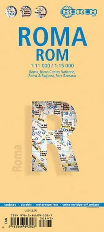 Folded street and travel map in color. Scale 1:11,000/1:15,000. Legend includes sights, museums, monuments, churches, chapels, synagogues, mosques, monasteries, archaeological sites, castles, ruins, beaches, golf courses, park+rides, subway, commuter train, airports/airfields, camping sites, hotels, markets. Includes inset map of Rome City Centre (1:11,000), The Vatican (1:7,000), Rome & Region (1:250,000), Foro Romano (1:7,000), Public Transport System and Top 30 Sights. Climate charts show the average daily temperatures, humidity, hours of sunshine and precipitation for each month.