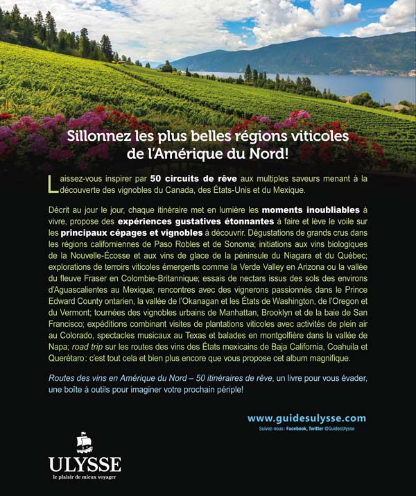 Routes des vins en Amérique du Nord – 50 itinéraires de rêve décrit chaque itinéraire au jour le jour et fournit pour chaque région visitée une fiche technique exposant les principaux cépages et des vignobles à découvrir. Il présente aussi des capsules sur des thèmes liés aux vins et à la gastronomie. Voilà un splendide cadeau à offrir… ou à s’offrir!