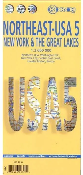 Regional coverage of The Great Lakes area in a durable laminated format. Includes insets of Washington DC (1:15,000), New York City (1:20,000), Boston (1:14,000).