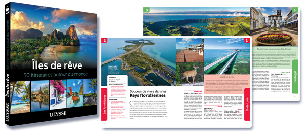 Émaillé de photographies somptueuses, Îles de rêve – 50 itinéraires autour du monde convie à s’imprégner des expériences mémorables et des moments de grâce qu’offre chacun des itinéraires dans plus de 210 îles : visites de villes historiques et de sites archéologiques entrecoupées de bains de soleil dans les îles dalmates de la Croatie; explorations des îles volcaniques des Açores; découvertes des plages et sites naturels remarquables de la Polynésie française; séjours dans l’archipel des Cyclades; plongées dans les eaux translucides des cayes du Belize; périples dans les paysages maritimes spectaculaires de l’île du Cap-Breton et des Îles de la Madeleine; écotourisme en Nouvelle-Zélande et en Islande; observation de la faune aux îles Galápagos; excursions pédestres en Corse et en Crète, de surf dans les îles de Vancouver et d’Hawaii, et de kayak en mer de Norvège; expéditions dans la mystérieuse île de Pâques, dans les îles aux charmes singuliers de la Bretagne et du fleuve Saint-Laurent.