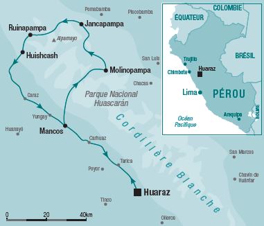 Trek en cordillère Blanche au Pérou Accueil / Contenus / Amérique du Sud / Pérou / Trek en cordillère Blanche au Pérou Cordillère des Andes péruviennes | © iStockphoto.com/hadynyah Extrait du guide : Randonnées de rêve - 50 itinéraires autour du monde Papier (livre entier) 34,95 $ Randonnées de rêve – 50 itinéraires autour du monde vous invite à partir à l’aventure dès la première page. Voir la suite La cordillère Blanche, considérée comme l’une des plus belles du monde, est un véritable paradis pour les trekkeurs. Ses sommets mythiques, tels le Huascarán (6 768 m) ou l’Alpamayo (5 947 m), sont d’une beauté indescriptible. Les glaciers s’élancent des hautes cimes pour finir leur course lente dans des lagunes aux eaux turquoise et émeraude, à la nature sauvage et préservée. Ce majestueux ensemble d’alpages, de vallées, de lacs, de glaciers et d’aiguilles, ourlées de dentelles de glace, constitue le cadre de la puissante géographie nord-péruvienne, que vous sillonnerez durant ce trek sportif en haute altitude. Jours 1 et 2Huaraz – Mancos À Huaraz (3 100 m), les cordillères Noire et Blanche se font face, formant une vallée traversée par le Río Santa. En longeant ce large sillon du Callejón de Huaylas, vous arriverez à Mancos (2 530 m), au pied du géant Huascarán (6 768 m). Une bonne acclimatation à l’altitude sera essentielle pour relever le défi du trek. Optez pour une belle balade dans la campagne en remontant doucement vers Armapampa (3 340 m). Déjà les vues sur les sommets de la cordillère vous donnent un aperçu de l’aventure qui vous attend! Jours 3 et 4Mancos – Molinopampa Le trek débute dans la vallée agricole d’Ulta, à un rythme doux, face à l’imposant sommet Contrahierbas (6 036 m) et à la belle pyramide Ulta (5 875 m). Puis vous remontez la quebrada (vallée) Cancahuapampa à travers des champs de lupins et de queñuas, seuls arbustes à pousser à cette altitude, jusqu’à une lagune. Premier col à 4 850 m et vue splendide sur la face est du Chopicalqui et le Huascarán. Jours 5 à 7Molinopampa – Jancapampa Dans la vallée de Huaripampa, vous croiserez des communautés qui travaillent la terre, à proximité de quelques villages andins traditionnels. Puis le sentier grimpe en lacet au col Alto de Pucaraju (4 650 m) avant de rejoindre la lagune Huecrococha (3 700 m), lieu magique de votre campement. Au bout de la quebrada Tingopampa, vous retrouverez la forêt puis les pâturages jusqu’au col Tupatupa (4 350 m). Descente dans la vallée de Nanayoc jusqu’au plateau de Jancapampa (3 600 m), un des plus beaux endroits du trek. Le lieu de campement est au fond du plateau, au pied du cirque glaciaire des Pucahirca. Jours 8 et 9Jancapampa – Ruinapampa Traversée du plateau pour rejoindre un sentier raide dans une zone de pâturages. La pente jusqu’au col Huillca (4 600 m) est soutenue. Le chemin vous mène de vallée en vallée jusqu’aux magnifiques lagunes de Safuna, situées au pied des faces ouest des Pucahirca. Le lieu de campement est encore une fois magique, face à l’Alpamayo. Vous vous sentirez isolé, mais heureux! Nouveaux cols à franchir à plus de 4 500 m entre les quebradas Tayapampa et Moyobamba. Faites une pause pour repérer les sommets Quitaraju, Alpamayo, Abasaraju et Santa Cruz. Descente dans la quebrada Alpamayo jusqu’au campement Ruinapampa (4 025 m). Jours 10 et 11Ruinapampa – Huishcash – Huaraz Début de matinée dans la vallée de l’Alpamayo, avant de vous en échapper par l’épaule ouest du mont Santa Cruz, en direction de Huishcash. Passage de deux cols : Los Cedros (4 760 m) et Osoruri (4 860 m). En face, les dents acérées des nevados (« enneigés ») Santa Cruz se reflètent dans les eaux turquoise de la lagune Cullicocha. Descente vers le campement de Huishcash (4 325 m), avec tout le long un magnifique belvédère sur la cordillère Noire. Le sentier en balcon se poursuit vers Hualcayan. Dernières images du Santa Cruz et vue sur le plateau cultivé de Hualcayan et sur la cordillère Noire en face, avant de rejoindre Huaraz en véhicule pour une nuit au chaud bien méritée! Pour qui ? Pourquoi ? Cette cordillère méconnue, et pourtant l’une des plus belles du monde, fera le bonheur des amateurs de haute montagne : majestueux sommets enneigés, lagunes glaciaires, nature sauvage... Un paradis pour les randonneurs bien entraînés. Quand y aller? De mai à octobre, durant l’été. Le climat est sec et la brume fait place au bleu infini du ciel, seulement découpé par la blancheur des sommets. Il fait néanmoins très froid à cette altitude. Extraits tirés du livre Randonnées de rêve – 50 itinéraires autour du monde, par un collectif d'auteurs Ulysse et les experts de l’Agence Terres d’Aventure, spécialisée dans la conception de voyages de randonnée et d’aventure.