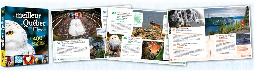 Le meilleur du Québec selon Ulysse - 400 expériences inoubliables Accueil / Contenus / Divers / Le meilleur du Québec selon Ulysse - 400 expériences inoubliables Le meilleur du Québec selon Ulysse met en lumière des centaines d'expériences uniques à vivre au Québec. Abondamment illustré de magnifiques photographies en couleurs, il regroupe par liste thématique les meilleures trouvailles des recherchistes d'Ulysse qui ont sillonné le Québec au cours des dernières années pour la réalisation de ses diverses publications. D'autres articles qui pourraient vous intéresser : LE QUÉBEC AVEC RODOLPHE LASNES L’IDENTITÉ BRASSICOLE QUÉBÉCOISE ESCALE À QUÉBEC AVEC ANNIE GILBERT