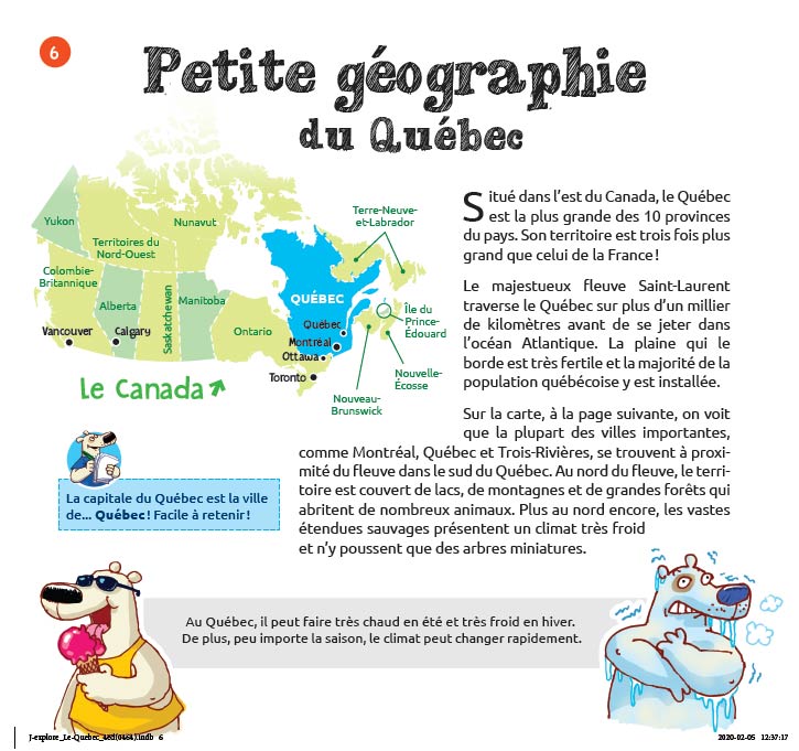 Petite géographie du Québec! Accueil / Contenus / Amérique du Nord / Le Canada, une question de géographie / Le Québec / Petite géographie du Québec! Acropoles des Draveures, Hautes-Gorges-de-la-Rivière-Malbaie © iStock / Vladone Extrait du guide : J'explore le Québec - Mon premier guide de voyage Papier (livre entier) 19,95 $ Unique dans l'édition jeunesse, J'explore le Québec s’adresse aux enfants de 7 à 11 ans! Voir la suite Petite géographie du Québec! Stimuler ses neurones et explorer la géographie du Québec en s’amusant, voici ce que propose cette capsule tirée du guide J’explore le Québec. Savais-tu? Savais-tu que le Bouclier canadien s'étend au nord du fleuve? Il couvre 90% du territoire de la province et il est constitué des roches les plus anciennes de la planète! Le passage d’un glacier il y a 15 000 ans a creusé la vallée de la Jacques-Cartier et celle des hautes gorges de la rivière Malbaie. C’est aussi grâce au mouvement de ce glacier, qui a écrasé, raboté et creusé la croûte terrestre, qu’il y autant de lacs au Québec! Car tous ces trous se sont remplis d’eau venue des averses incessantes à cette époque et de la fonte des glaces. Savais-tu que le fleuve Saint-Laurent occupe la frontière entre deux régions géologiques? D’un côté le Boulier canadien et de l’autre, les Appalaches. D'autres articles qui pourraient vous intéresser : POURQUOI « CAPITALE MONDIALE DE LA POÉSIE »? PLAISIRS NAUTIQUES AU QUÉBEC PETITE HISTOIRE DU QUÉBEC!