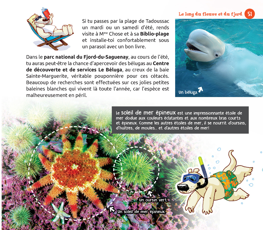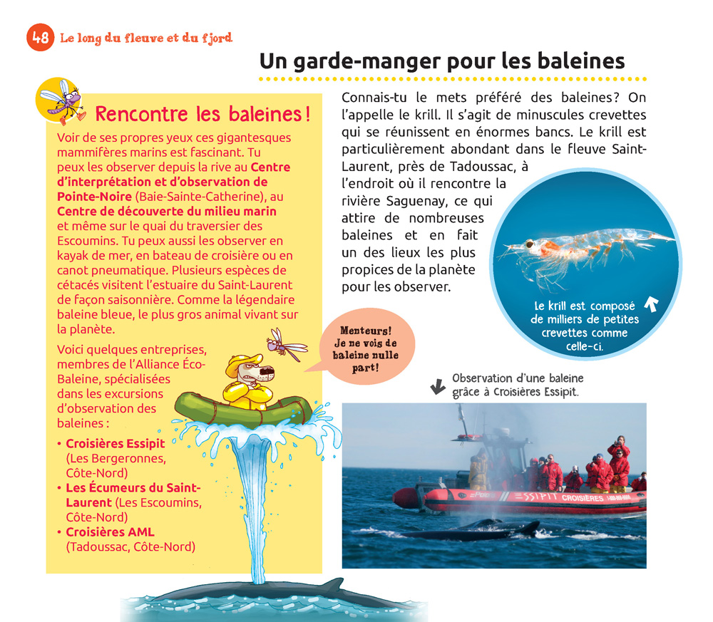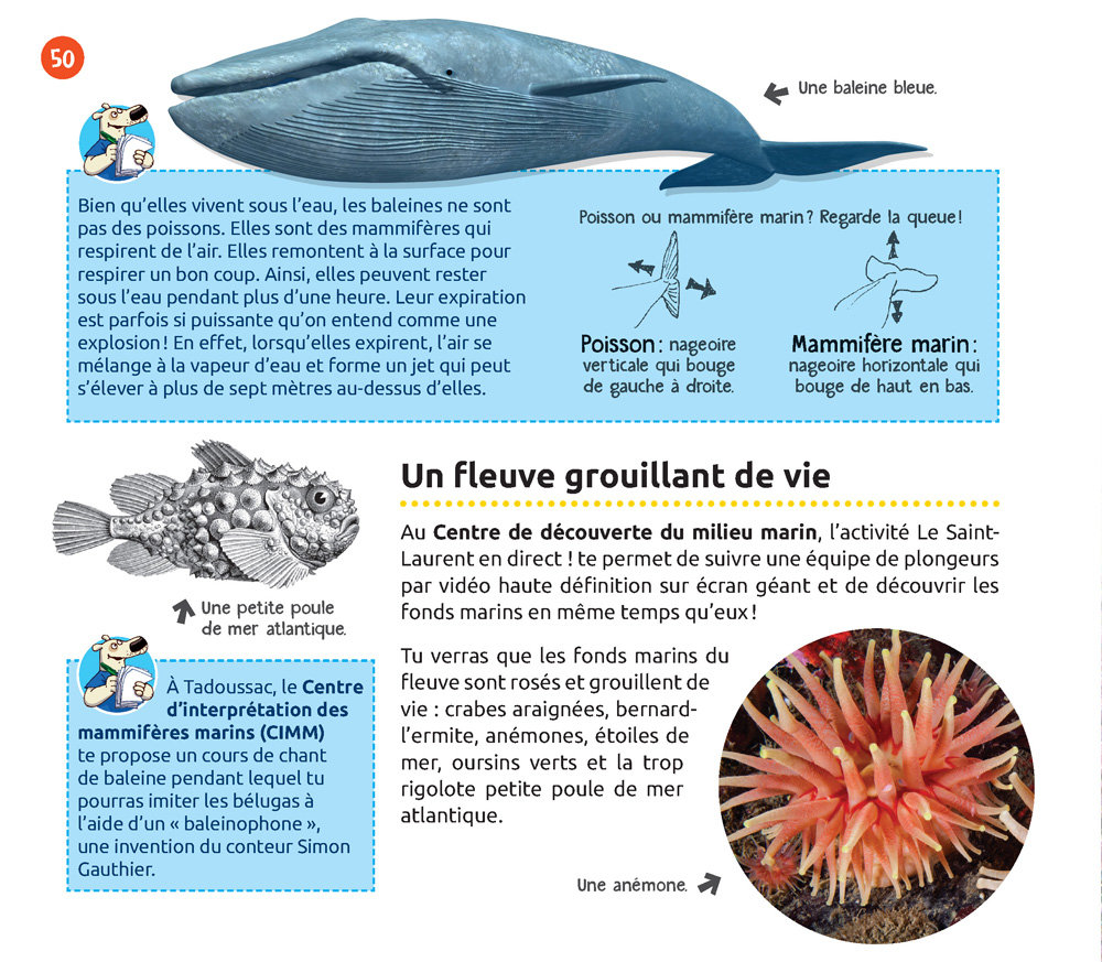 Le fleuve Saint-Laurent et ses baleines! Accueil / Contenus / Amérique du Nord / Le Canada, une question de géographie / Le Québec / Le fleuve Saint-Laurent et ses baleines! Une baleine de Minke ou petit rorqual dans le Saint-Laurent (balaenoptera acutorostrata) © iStock / Pascale Gueret Extrait du guide : J'explore le Québec - Mon premier guide de voyage Papier (livre entier) 19,95 $ Unique dans l'édition jeunesse, J'explore le Québec s’adresse aux enfants de 7 à 11 ans! Voir la suite Le fleuve Saint-Laurent et ses baleines! Savais-tu que le fleuve Saint-Laurent abrite 13 espèces de cétacés? Parmi celles-ci, notons le cachalot, le rorqual à bosse, le dauphin à nez blanc, le marsouin, le béluga et la baleine noire. Ces baleines fréquentent le fleuve surtout en été, car elles y trouvent une abondance de nourriture. On peut alors en observer plusieurs espèces depuis la terre ferme, notamment dans la région de la Côte-Nord, dont le petit rorqual et le rorqual commun, qui peut vivre plus de 100 ans! Les dents et les fanons La plupart des cétacés ont des dents (cachalot, dauphin, marsouin et béluga) et se nourrissent de toutes sortes de proies, petites ou grandes. Certaines baleines ont plutôt des fanons et se nourrissent de proies minuscules. Les fanons sont faits de kératine, comme tes ongles et tes cheveux! Ils agissent comme un peigne fin qui emprisonne le krill dans la gueule de la baleine. D'autres articles qui pourraient vous intéresser : LE MÉTÉORITE DE LA BAIE D’HUDSON LE CIRCUIT DES MURALES DE SHERBROOKE LE LAC SAINT-PIERRE LA ROUTE DES BALEINES