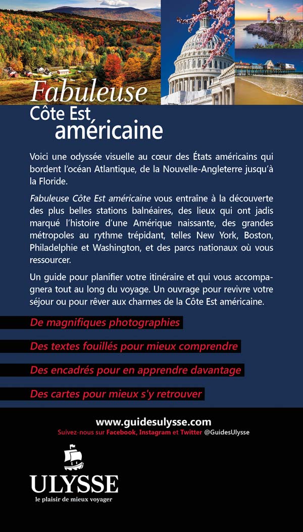 Fabuleuse Côte Est Américaine propose aussi un solide portrait historique et culturel de l’Est américain. Des cartes géographiques, claires et précises, parsèment cet ouvrage tout simplement fabuleux. Fabuleuse Côte Est Américaine, un guide pour planifier votre itinéraire et qui vous accompagnera tout au long du voyage. Un ouvrage pour revivre votre séjour ou pour rêver aux charmes de la Côte Est américaine.