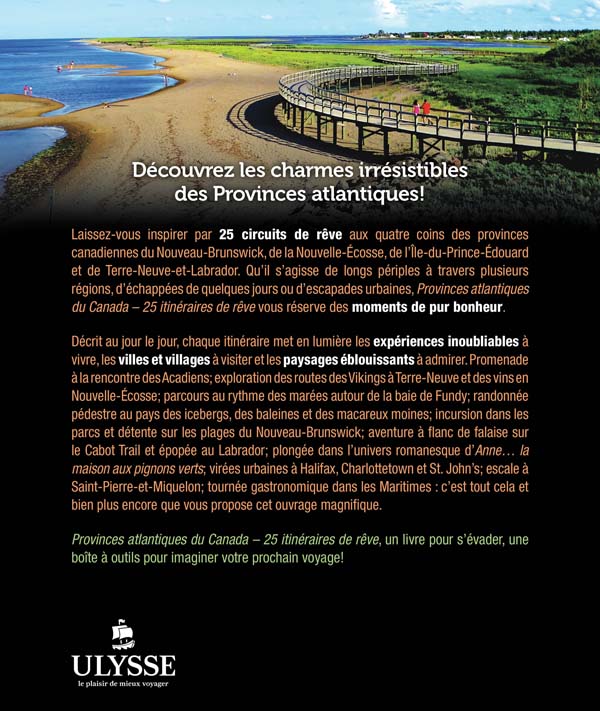 Abondamment illustré de photographies spectaculaires, Provinces atlantiques du Canada – 25 itinéraires de rêve vous invite à vivre des moments de pur bonheur : voyage à la rencontre des Acadiens; exploration des routes des Vikings à Terre-Neuve et des vins en Nouvelle-Écosse; parcours au rythme des marées autour de la baie de Fundy; randonnée pédestre au pays des icebergs, des baleines et des macareux moines; découverte des parcs et des plages du Nouveau-Brunswick; aventure à flanc de falaise sur le Cabot Trail et épopée au Labrador; plongée dans l’univers romanesque d’Anne… la maison aux pignons verts; virées urbaines à Halifax, Charlottetown et St. John’s; escale à Saint-Pierre-et-Miquelon; tournée gastronomique dans les Maritimes, et bien plus encore.