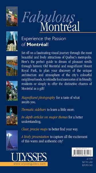 Ulysses leads the way on a visual journey into the heart of the vibrant city of Montréal. This full colour guidebook boasts an incredible selection of striking photographs and a modern and dynamic interior layout that combines descriptions, sidebars, maps and illustrations. Starting off with a complete historical, geographical and cultural overview of Québec’s metropolis, Fabulous Montréal then explores the various attractions, museums, parks and neighbourhoods of the city, including Old Montréal, the downtown core, the underground city, The Main, Mount Royal, the Olympic Stadium, Notre-Dame and Sainte-Hélène islands, Plateau Mont-Royal, Mile-End, the Quartier Latin, the Golden Square Mile, the Lachine Canal, Westmount, Shaughnessy Village, Little Italy and Outremont. Montréal’s world-class festivals are also featured, including the ever popular Montréal International Jazz Festival and Just for Laughs Festival. The guide’s last chapter examines the various outdoor activities that can be enjoyed in each season and provides a treasure trove of information on the city’s flora, fauna, architecture, literature, music, popular arts... and much more!